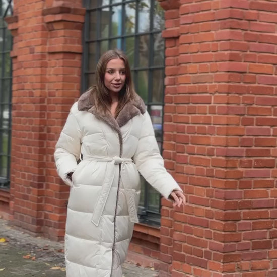 A stylish midi-length down jacket is perfect for chilly days. It features a voluminous cut with a waist belt that accentuates the figure, complemented by an elegant faux fur collar that adds a luxurious touch. Thanks to its warm lining and high-quality materials, the jacket ensures comfort and protection against the cold, while its versatile design makes it an ideal option for both everyday wear and more formal occasions.